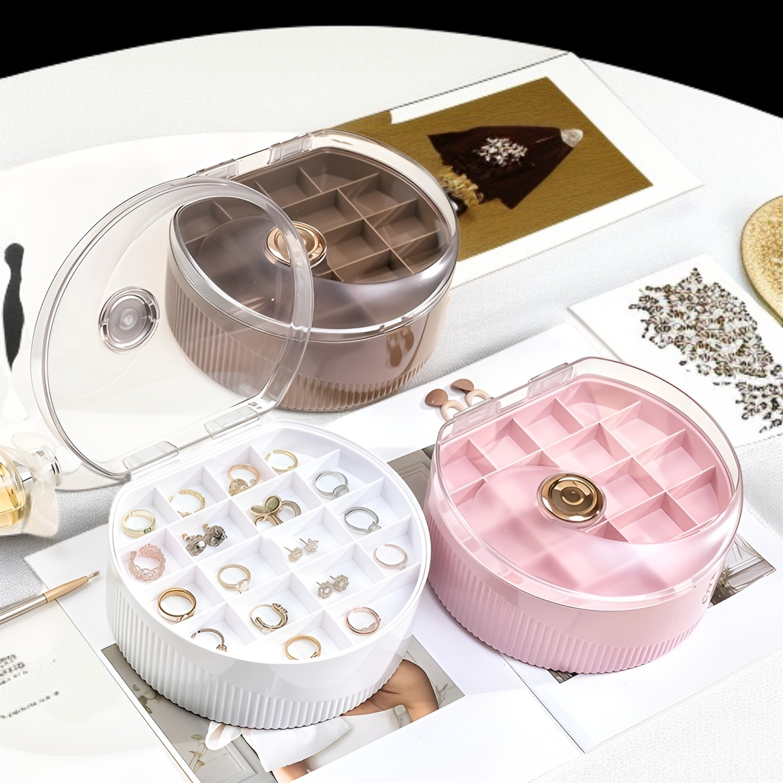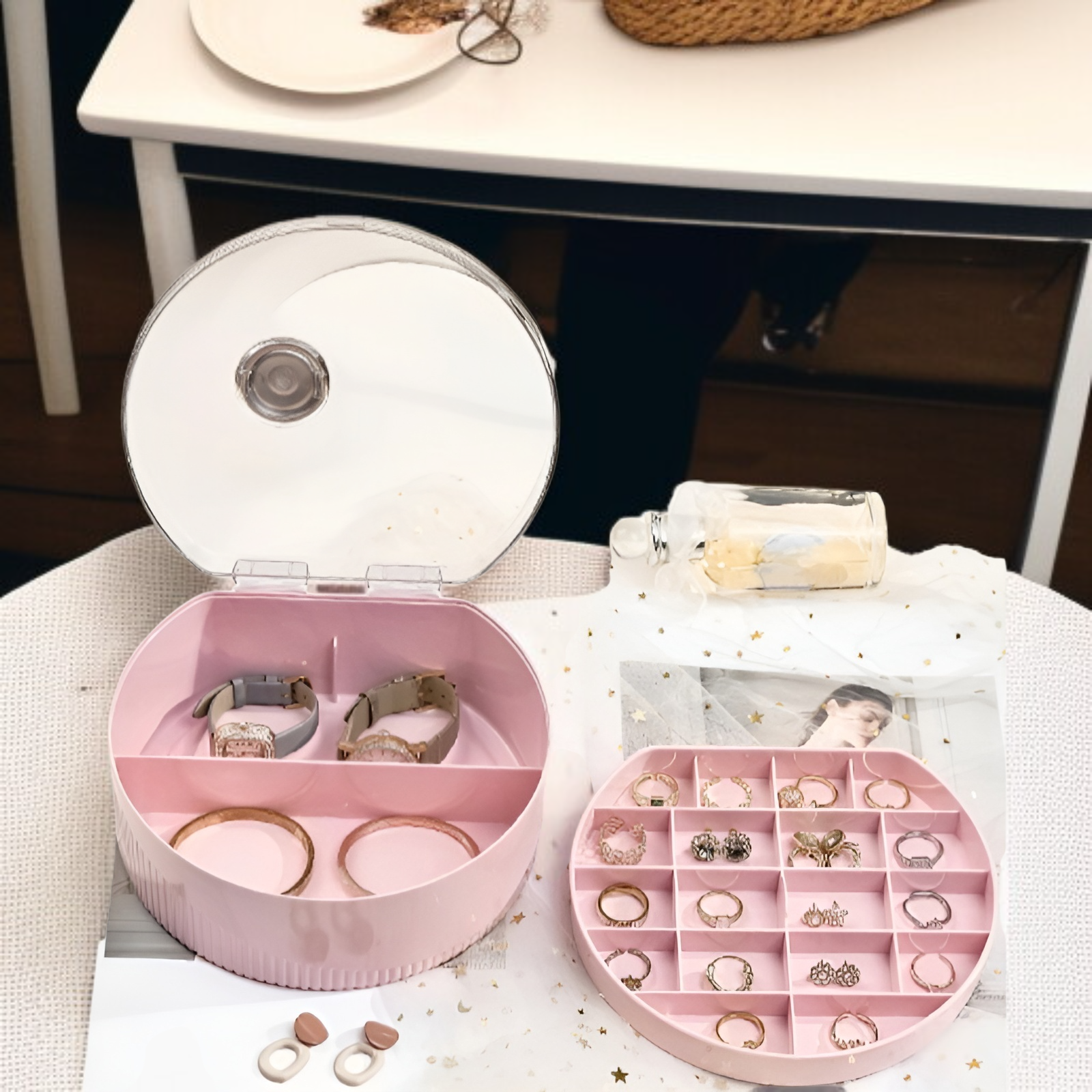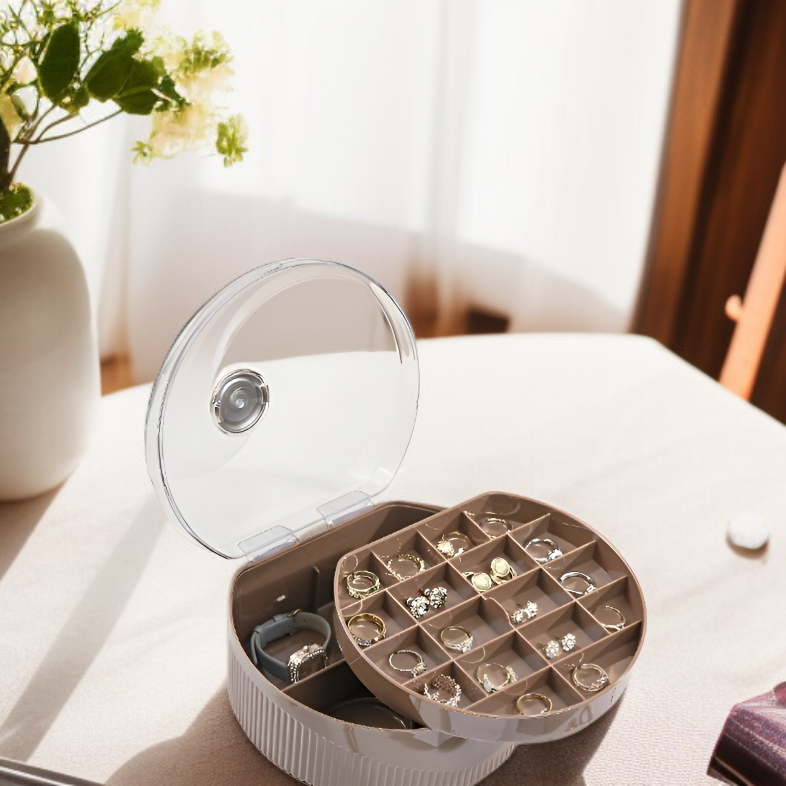 軽量で持ち運び便利な二層構造。高級素材使用でイヤリングやネックレスを安全収納。シンプルデザインで様々なインテリアに調和。