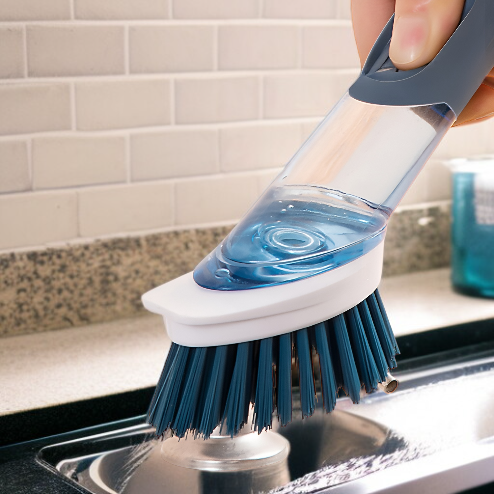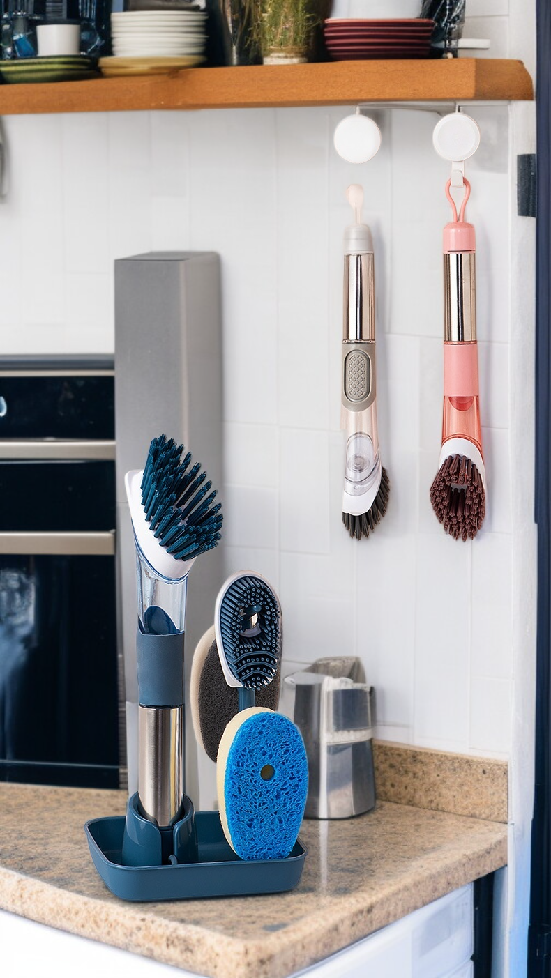 食器用洗剤自動注入、長柄で手を汚さず洗浄。スポンジ・ナイロンブラシ交換可能。4in1多機能でキッチン掃除に便利。